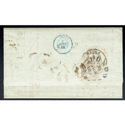 1838 (16 Aug) Entire Letter New York USA to Reims, France, sent per Steamer Great Western leaving New York to Bristol with two line boxed BRISTOL / SHIP LETTER in black on obverse, various chargemarks, and French ANGLETERRE red CDS on obverse. LONDON dated arc, Paris & Reims backstamps.