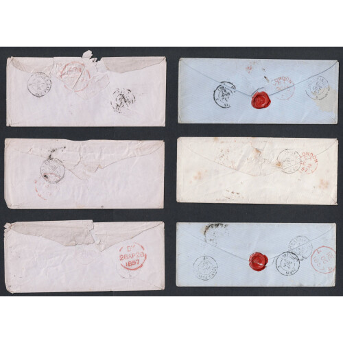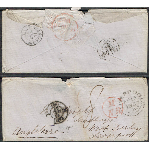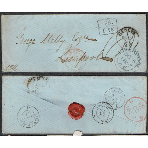 1857 Seven stampless covers from same correspondence to Liverpool including from Geneva, Venezia, Paris, Chamonix, each with manuscript 6 or 8 charge mark and three with boxed two line FR. / 1F78c French Exchange Office Entry mark plus various transit cancels and Liverpool dotted arc receiving h/s on obv., faults incl wrinkles and tones, intr group (6).