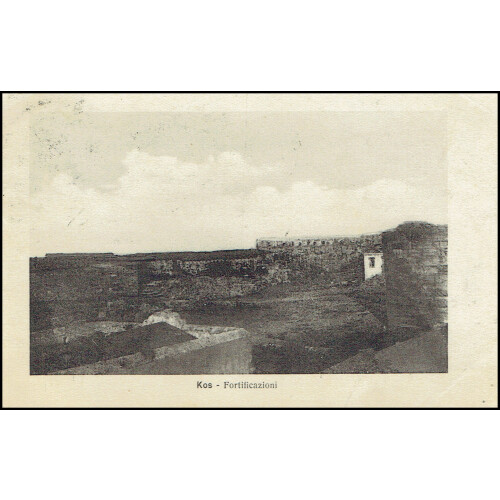 Rhodes: 1919 (9 Sept) Postcard of Kos bearing Italy 10c red ovtpd Rodi tied RODI cds cancel and two line VERIFICATO PER CENSURA / CENSORE N1- RODI (EGEO) h/s in blue-green.