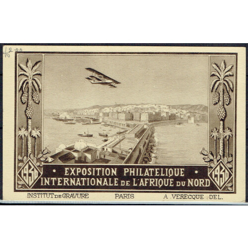 1930 (10 May) Registered Algeria to Casablanca Philatelic Expo. picture postcard to Paris bearing Expo label in blue tied special wings h/s, 1f25 & 65 on 60c tied Expo CDS, and violet (5000 examples made) h/s No.4753. Attractive postcard.