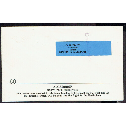 1925 British Arctic Expedition Specimen Algarsson Airship Flight label on printed cover. Blue label tied by vertical SPECIMEN handstamp in violet numbered 60. The expedition was led jointly by Frank Worsley & Grettir Algarsson to sail to Spitzbergen and Algarsson would fly to the Pole by plane or small airship, crash the plane and sledge back. Lack of funds forced them to abandon the idea of the conquest by air. Labels were produced for a proposed trial flight by dirigible from London to Liverpool and this is one of approx. 100 covers produced. Very scarce. AA #PP38a.