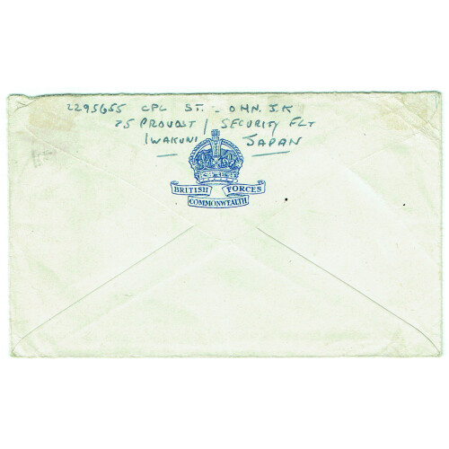 Br. Commonwealth Occupation Force Japan: 1946 OAS cover to London bearing BCOF JAPAN 1946 overprint 1d brown-purple vertical pair tied part CDS cancel (incomplete) with senders address on reverse: provost security flt, Iwakuni. Nice genuine use. SG J2.