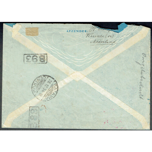 1934 (19 Dec) Uiver Crash cover from Netherlands printed airmail cover torn recovered from the crash of the Uiver in bad weather in the Syrian desert, forward to Batavia in Dutch East Indies with red cachet on obverse. Of the 51,000 Christmas mail items forwarded on the Rijstvogel 208kg were salvaged of the 350kg.