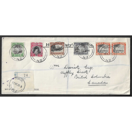 1933 (12 Oct) Long printed OHMS cover (creases) to Canada bearing 1932-6 five different values ½d, 1d, 2d, 2½d, 6d pair tied NIUE CDS cancels with R 74 etiquette, SG 62/5, 67 Cat £159 on cover.