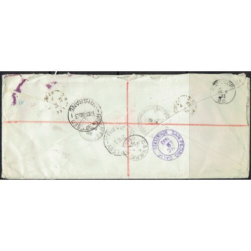 1933 (2 Nov) 1944 (23 Dec) 5d bluish slate and pale brown on regd long cover to Heffley Creek Br. Columbia, Canada. Tied PORT MORESBY CDS's, few wrinkles otherwise pretty cover. SG 100. Good cat on cover.