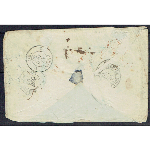 Reunion: 1866 (19 Nov) Slightly wrinkled cover from REUNION ST DENIS unstamped soldier's letter to France with CORR. D. ARMEES ST DENIS octagonal cancel blue alongside, 6 charge mark (9 h/s applied upside down to make 6), red similar d/s and transit and arrival backstamps, wrinkled but nice early army envelope.