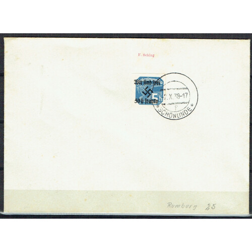 Occupation of Sudetenland: 1938 (8 Oct) Rumberg unaddressed covers (2) each bearing Wir Sind Frei 50h on 2h brown or 50h on 5h blue imperfs both tied SCHONLINDE 2.X.38 CDS cancels, light tones and each expertised on obverse by F Schlag. Michel 24/5 Cat €400.