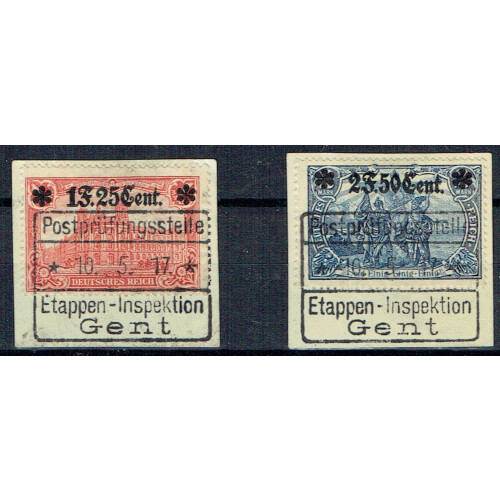 Western Military Command Area: 1916 1f25c on 1m and 2f50c on 2m singles both tied to small piece by Western Staging Area Etappen Inspektion Gent dated boxed cancels for 10th May 1917. Michel 11 & 12.