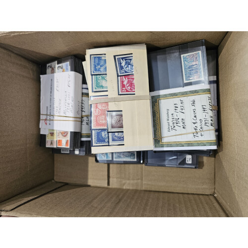 Extensive mainly unmounted mint stock on dozens of stockcards in bundles with mainly complete sets for worldwide countries ranging 1956-2001 including Laos, Lebanon, Tunisia, Turkey, Thailand, Mali, Marshall Is., Mauritania, Mauritius, Micronesia, Papua & New Guinea, Comoro Is., Congo, Colombia, Pitcairn Is, Portugal, East Germany etc, plus many more, huge qty, STC Approx. US$1100.