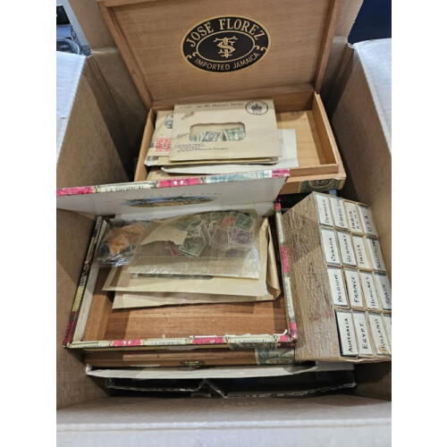 OLD TIME accumulation off and on paper sorted into cigar boxes and envelopes for worldwide countries with amazing diverse range of different mint and used, noted France, Canada, Jamaica, Australia, Br. Africa, etc, 1000s.
