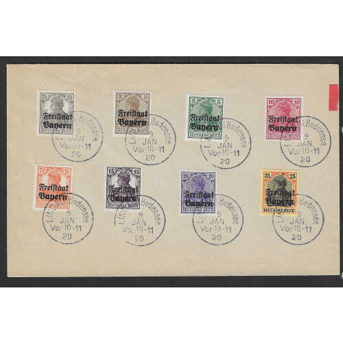 Bavaria: 1920 Two envelopes bearing the full set of 16 'Friestaat' overprints all tied with LINDAU / Bodensee Year dated cds's. Covers unaddressed and clearly philatelic but a very fine and fresh pair of covers SG 215/30.