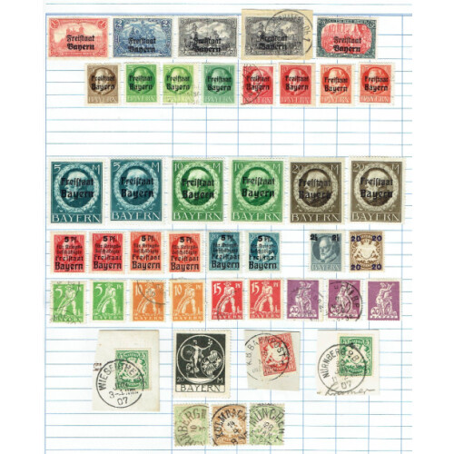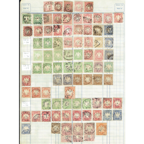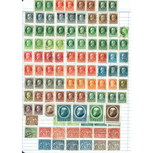Bavaria: Collection mint & used stamps on large old time ledger pages unpicked with good range of duplicated issues including 1849 3k blue (27, all different numeral postmarks), 1850-85 1k rose (4), 6k brown (20), 9k green (12), 12k red, 1862-63 1k yellow (3), 3k red (17), 6k blue (10), 9k bistre (5), 12k green, 1867 Arms to 7k blue imperf, 1876 to 2m, 1911-2m used, etc. Ideal to fill those gaps. 100s.