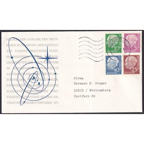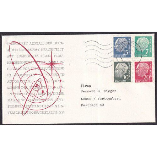 1961 Two illustrated typed covers bearing Heuss flourescence paper set of 8 over two covers tied 1961DARMSTADT 2 CDS cancels, scarce, Michel 179yW, 181yW, 183 yWa-186yW, 259y, 260y. Cat €450.