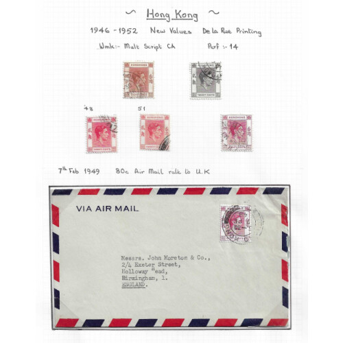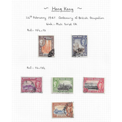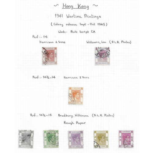 1933-1952 Mint and mainly used collection arranged by printings on leaves STC £1000 with around 65 stamps noted 1938-65 P. Dues to 50c mint, Japanese Occup. HK 3yen on 2s scarlet mint, 5yen on 5s claret used (usual uneven perfs, Cat £160), 1938 GVI defins to $10 used, 1941 Centenary set used, couple of GVI covers etc, approx 65, STC £1000.