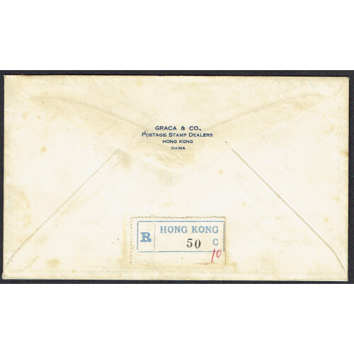 1937 (12 May) Illustrated registered FDC set of three tied REGISTERED HONG KONG cds with typed addr to Kowloon.
