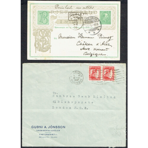 1908 5a green postal stationery card to Belgium cancelled REYKJAVIK 13.1.09 cds with SHIP LETTER / TROON boxed h/s in black, arrival cds, beautiful cover, fine and scarce. Additional 1937 Paquebot Edinburgh cancel on cover to London.