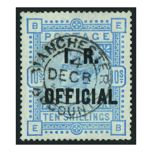 Inland Revenue: 1884-88 I.R. OFFICIAL QV 10/- ultramarine on white paper. Superb VFU with Manchester cds. SG O10 cat £3750+. Beautiful stamp & extremely rare as such a nice genuine example. 1984 BPA & 2012 RPSL photo certs.