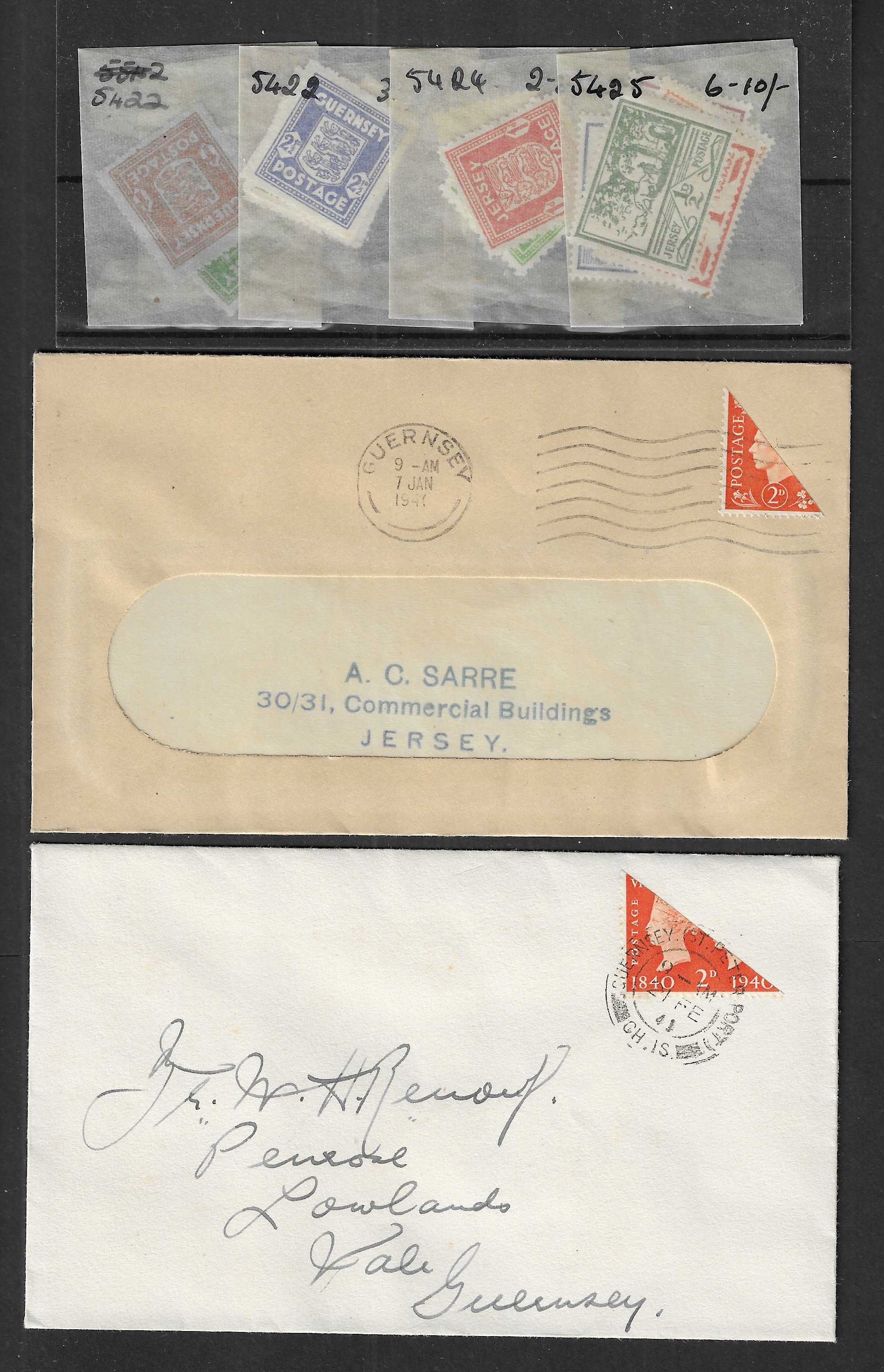 Wartime issues U/M sets for Guernsey and Jersey incl blue banknote set 2, plus two GVI bisect covers for 2d orange defin and 2d orange Stamp Centenary. Nice group.