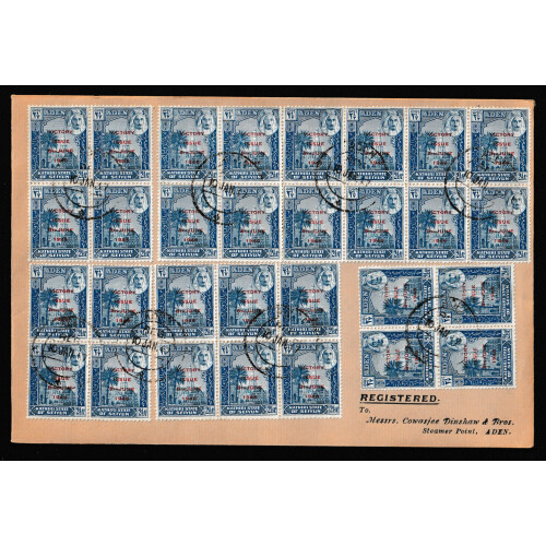 Qu'aiti State in Hadhramaut: 1946 Victory two large covers bearing 1½a carmine (24 examples in pairs and blocks), 2½a blue (30 in blocks) both used 10th Jan 1947 cds cancels, printed addr to Steamer Point Aden. SG 12/13. Attractive.