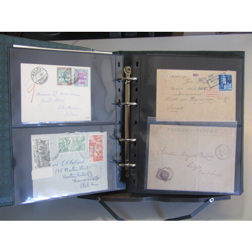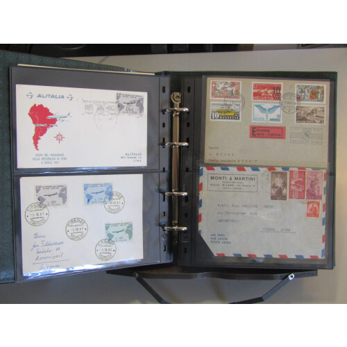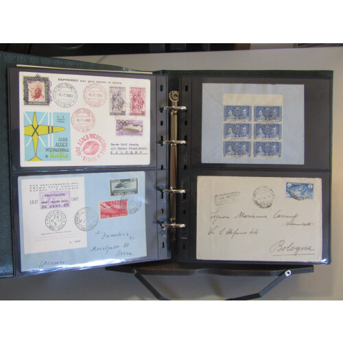Cover album with a wide range of prestamp to modern issues with strength in Italy flight covers from 1940s, Philippines 1940s Jap. Occup FDCs, Switzerland airmail combination, Austria and Switzerland earlies, India WW2 censor covers and airletters, Germany 1936 Zeppelin Olympic Flight cacheted cover, France 1937 Museum set on special page tied, 1949 Stamp Centenary maxi cards, 1936 Aviation combination special card for Aviation meeting Le Baule, 1953 Trieste Nato FDC, 1950 Tobacco FDC, ERP 1949 FDC, 1917 Torino 1st Flight cvr, Austria early covers / entires, Italy 1860s Int. Post form handstamped Specimen (many faults), approx. 60 items.