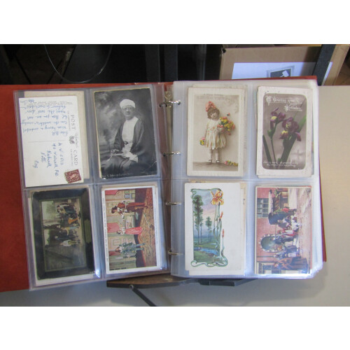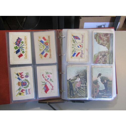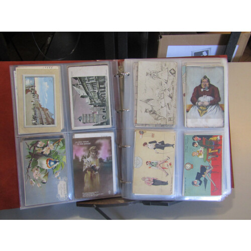 Collection in a binder arranged in postcard sleeves from EDVII period onwards very mixed but included WWI silks (9), 1907 Camp Retford hand sketched drowning in rain at the camp, 1906 unstamped PPC of large lady in chains and padlock through her nose, EDVII-GV humour cards, real photo family portraits, 1908 Arrival by airship Franco-British Ex., Aden, Japan, etc, approx. 100+.