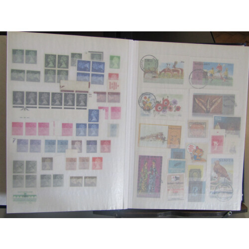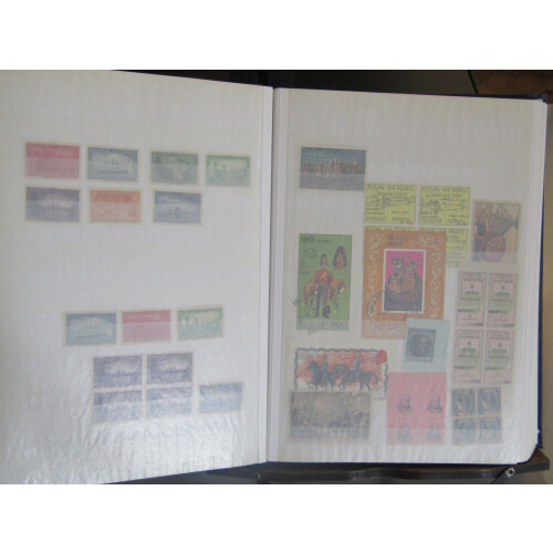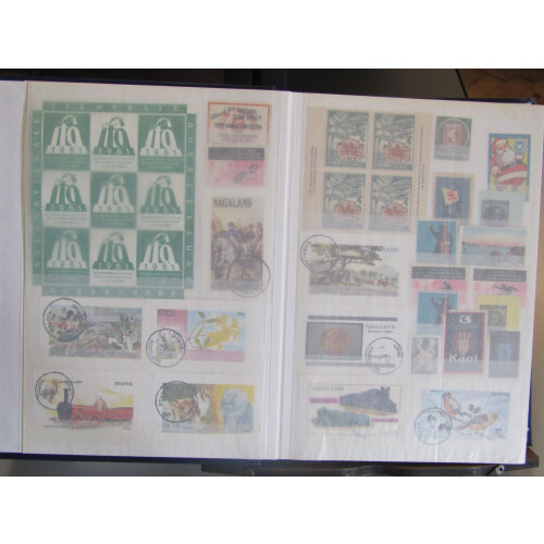Well filled stockbook with large collection of poster stamps, revenues, GB locals, other local posts incl India 1854 4a design in facsimile blocks of 4 (10), some 'used' with dotted diamond cancels, different Indian states forgeries in blocks and singles, reprints, many attractive items and thematics etc, 100s.