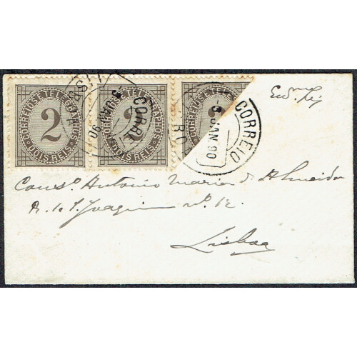 1890 (3 Jan) Local cover sent in Lisbon bearing 1884 2r black pair, plus additional 2r black bisected diagonally to make 5c rate, tied 3 Jan cds's, the stamps are toned, neat cover. High cat on cover.