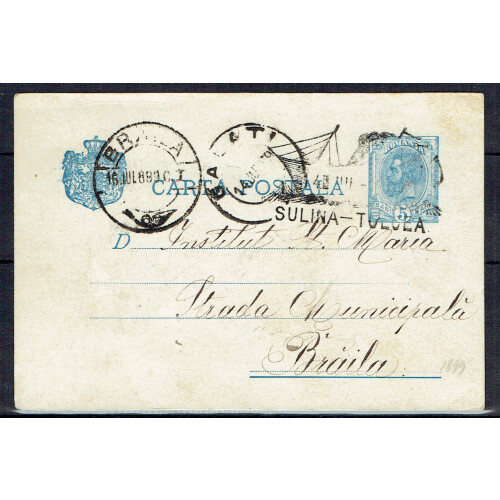 Danube Shipmail: 1889 Sulina - Tulcea handstamp on 5b blue postal stationery envelope dated 4 July from Galati with cds to Braila cancelled with illustrated Ship and SULINA - TULCEA partial datestamp. Fine and genuine use. Scarce.