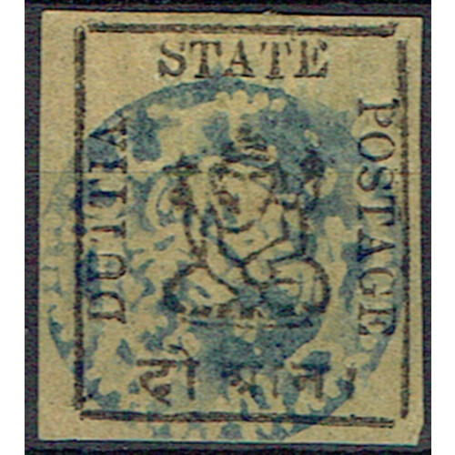 Duttia: 1897-98 Type I 2a black on yellow fine used four good to large margins with neat blue cancel, expertised h/s on reverse, very fine for these, SG 10.