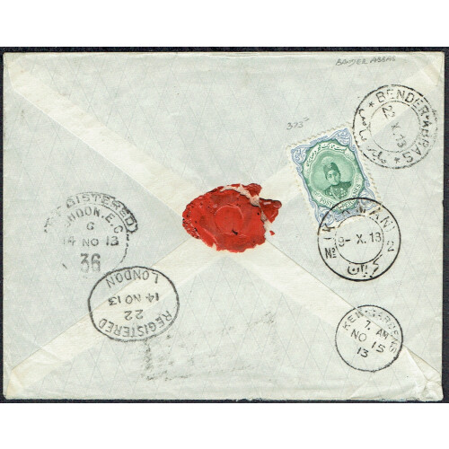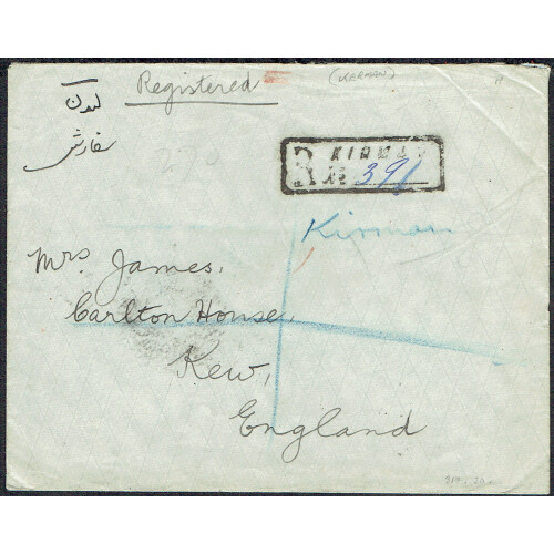 1913 Cover Kirman to UK bearing 1911 26ch tied KIRMAN / No. 2 cds cancel, sent via BENDER ABBAS and regd h/s on obverse No. 391. Three transit and arrival backstamps. Pretty cover. SG 373.