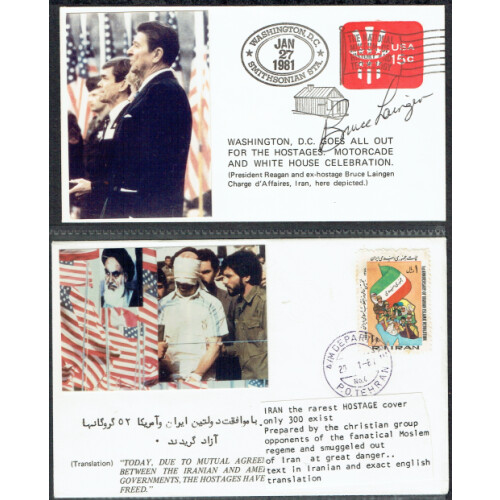 1981 Two covers relating to hostages released in Jan 27th one signed by one of the freed hostages Bruce Laingen, the other is a printed Arabic cover (only 300 issued) from the Christian Group against fanatical Muslim regime. Intr. (2).