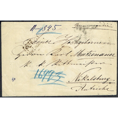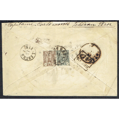 Circa 1885 10c & 1k grey tied by TEHERAN cancel on cover to Nikolsburg Austria (now in Czech Rep) sent registered hence crayon manuscript and further marks crossed out, transit cds alongside with arrival backstamp, very fine. SG 73/4. Faults.