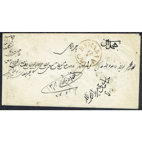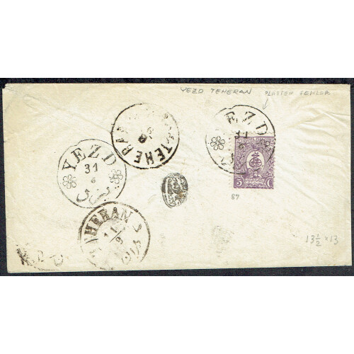 Circa 1889 Internal cover bearing 1889 5c lilac perf 13½ x 13, tied YEZD (with dented circle) sent via TEHERAN and HAMADAN arrival on obverse. Nice internal cover.