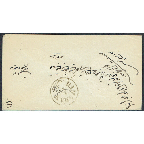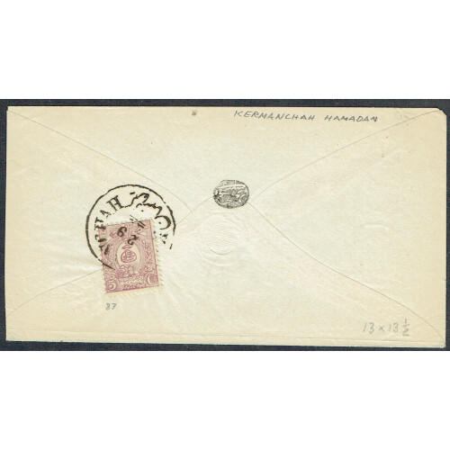 Circa 1889 Internal cover bearing 1889 5c lilac perf 13 x 13½, tied KERMANCHAH to HAMADAN arrival on obverse. Nice internal cover.