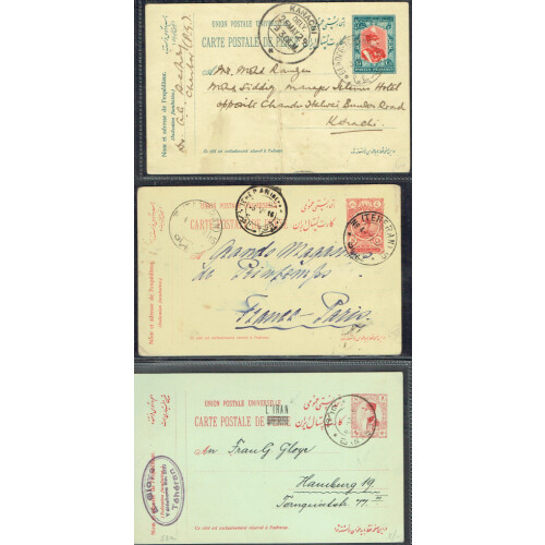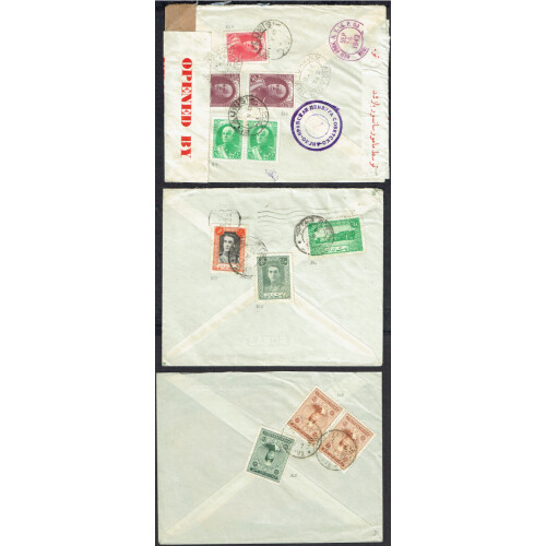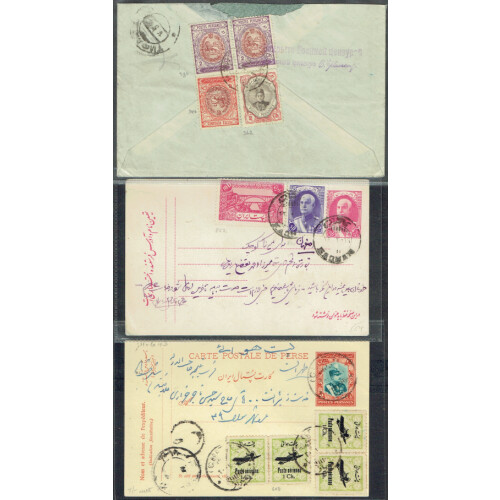 Group of mainly earlier covers and cards many with multi franked rates sent locally or overseas, noted five P/Stationery cards, two are uprated from the 1920s, unstamped PPC from Schimeran, 1930s-40s combinations to Austria or New York, 1945 censored to UK bearing Anglo Soviet Persian 14 censor cancel in violet plus similar censor cvr from Tauris. Intr. (11).