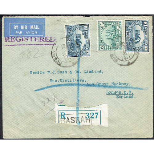 1929 (27 Nov) Registered cover Basrah to London bearing 3a blue (2) & 6a tied BUSRA cds's, torn regd etiquette 327, nice commercial cover.