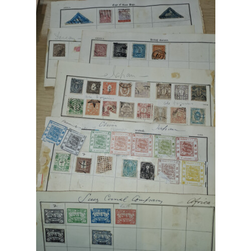 An old time range of forgeries and 19th century to middle periods world countries on old time pages including St Helena, Br. Colombia, Shanghai Candereens (9), German states, Spain, Italian states, Japan, USA locals / carriers, etc, 100s.