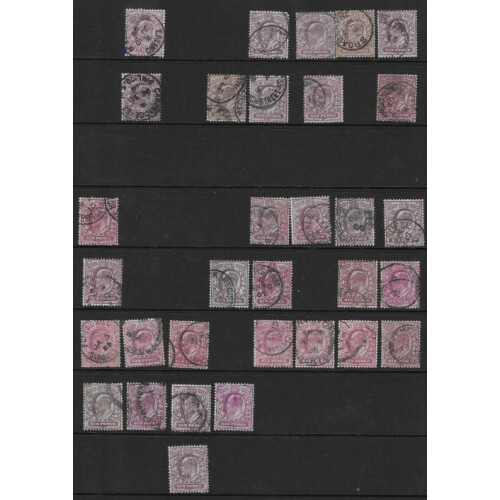 1902-11 6d purple attractive selection of 63 examples on Hagner page including many shades, some mixed minor faults, small stains or crayon lines, a few have colour gone, mostly regd, CDS or light cancels, Cat £1386+. Unchecked for shades and varieties.