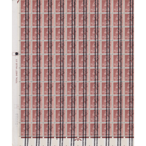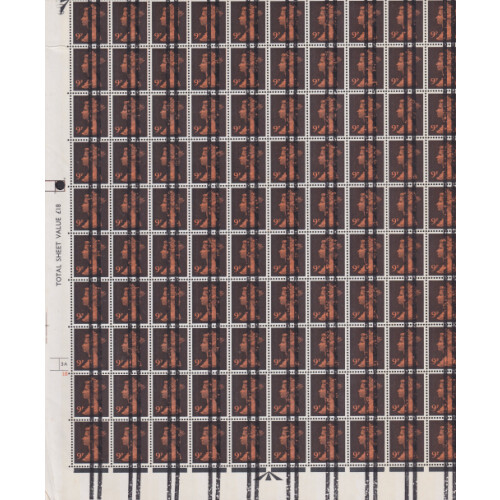 Post Office Training: Machin low values in 14 sheets of 100 from ½p to 9p black on orange all unmounted mint each showing cylinders and marginal imprints, total of 14 sheets of 100 (1400 stamps) each cancelled by vertical bars, plus 1979 Training recorded delivery envelope.