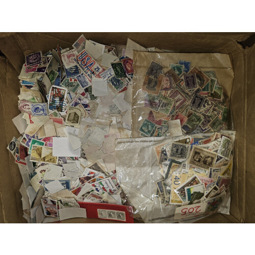 LOOSE on and mainly off paper worldwide sorted into a large qty of plastic trays and tubs, mixed used, some by country in four boxes, 1000s.