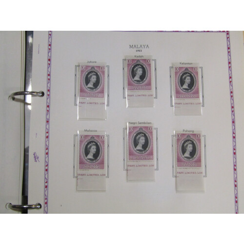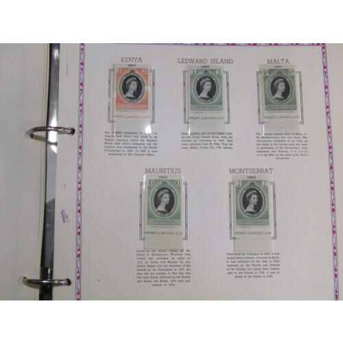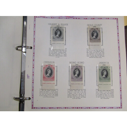 1953 Coronation complete hinged mint set in special printed loose-leaf binder plus many in complete blocks of 4. Fine.