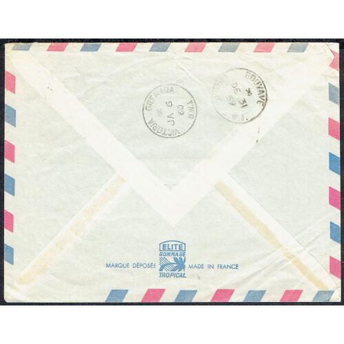 Missent to British Guiana - Single line h/s in violet on 1960 airmail cover from Guyana to Grenada bearing French 50f adhs tied CAYENNE GUYANE cds, with VICTORIA GRENADA arrival cds alongside.