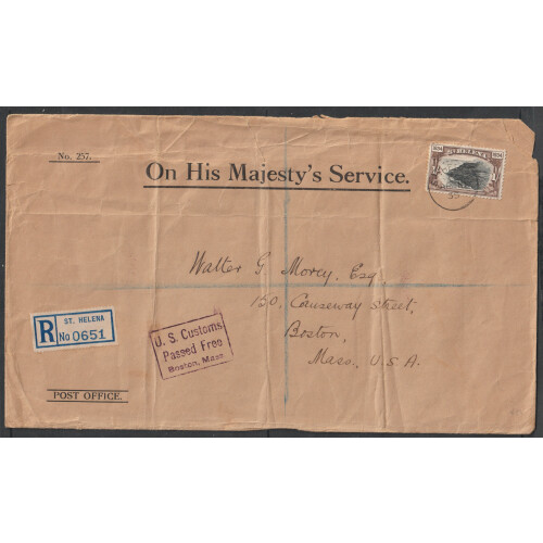 1934-35 Two large registered OHMS envelopes (creased, torn and folded) both to USA, 1934 bearing 1½d, 2d & 3d pictorial issue tied 20th Dec cds's, 1935 cover bearing 1s pictorial issue tied 10th April cds and US Customs Passed Free h/s.
