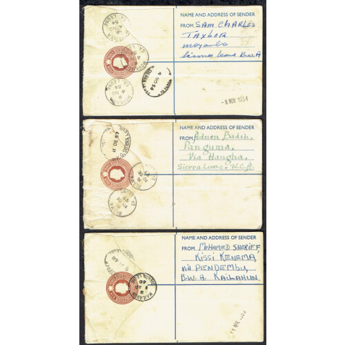 1954-57 Three 4d brown QEII Registered postal stationery envelopes one uprated with GVI 1/3d tied MOYAMBA cds and regd etiq., 1957 BLAMA uprated with QEII defins 2d pair and 6d pair and 6d brown airmail from KAILAHUN all to UK, some faults. (3).