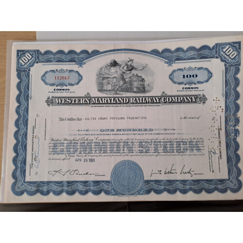 USA Railroad Share Certificates: Attractive small group including 1939 Baltimore Ohio Railroad 2 shares at $100 each with Interbond AG Guarantee certificate, 1969 Chicago, Rock Island & Pacific Railroad Co., 1957 Allegheny & Western Railway, 1958 Seatrain Lines, 1927 Trust Certificate, 1942 The New York & Harlem Rail Road Co., 1940 Old Colony Railroad Co., 1956 Delaware Lackawanna & Western Rail road Co., 1961 Western Maryland Railway Co., 1950 Pittsburgh & West Virgina Railroad Co., few faults mainly fine. (11).