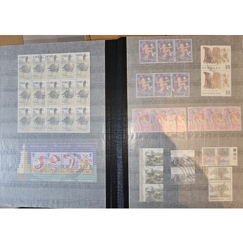 World accumulation in a BOX with many different countries and ranges in stockbooks and albums, or loose in envelopes, stockbook of Scandinavia in used blocks of 4 (well filled), various in binders, Finland 2007 year pack etc, 1000s.