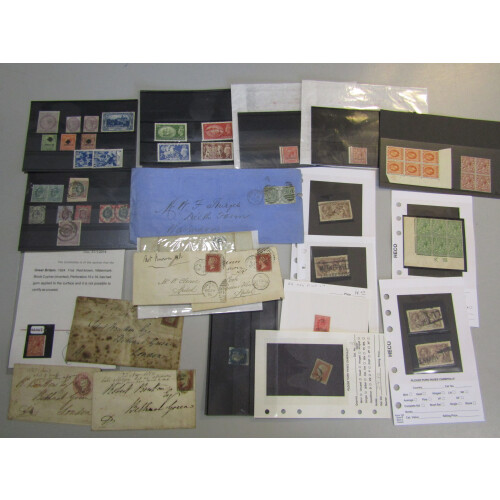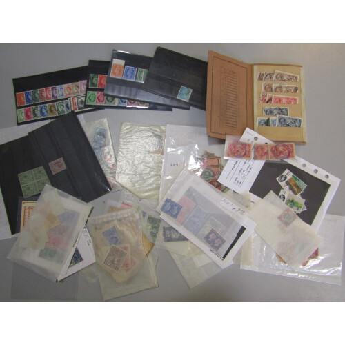 Smaller carton with a 'better' pre decimal accumulation with strength in QV to GV period chiefly used on stockcards, hagner, pocket book, packets, etc,..plus commercial covers. Includes 1840 1d black (poor) & 2d blue, QV surface printed & line engraved vals to 5/-, EDVII to 2/6d, GV many Seahorses with six 10/- values, GV defins ½d, 1d & 1½d all with central cross cut out of centre with 'CANCELLED' ovpt and a further 1d & 1½d ovpt 'CANCELLED', GVI with 1948 RSW set m., 1951 Festivals high vals to £1, 1964 Lifeboat Phosphor set umm, and much more inc. a few Revenues, Officials & cinderellas. Well worth viewing & would suit e bay trader (100s)