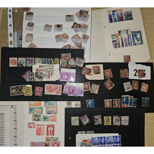 Accumulation in a small carton with dozens of worldwide on stockcards, envelopes, pages and loose, interesting sorter noted Korea 1968-9 Album to commemorate the 16th UPU Congress with mint sets affixed into delegate book, Libya 1979-80 year pack, Kuwait 1969 delegate book, Denmark 1937 kings blks of 4 mint, Turkey 20pa embossed censored env to Alexandria with double censor, various covers incl singed, military mail, 1885 The Huntly Express wrapper with 1d lilac, N.Z. Harrison & Sons presentation card, GB 1883 10s with heavy cancel and faults, GB QV onwards on cards etc, 100s.