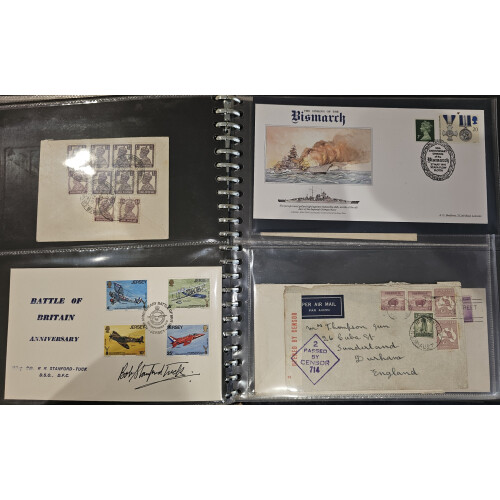 Accumulation in a carton with dozens of WWII censor and a section of aerogrammes with RAF Censors, GB 1958 N. Ireland & Scotland FDI (Cat £70), Falkland Is. 1937 Coronation set on folded cvr, 1980 Birds FDC signed Peter Scott, Australia censor with nice 2s Roo combination, Spain 1947 Stamp Exhib. card used with special pmk and fancy illustrations, Lebanon censored to Ireland, 1954 Posted on Thursday Is., 1940 USA parcel post tag with $5.40 combination, 1944 Ndola to N.I. airletter, Greece 1946 censor to N.I. tied THESSALONIKI EXPEDITION cds cancels from the Greek Civil war, Latvia 1930s censor, some PPCs with saucy themes, Malta 2d regd P/S uprated to UK, Japan Dairen regd cvr, Jamaica 1936 2½d reply coupon, N.Z 1937 1st airmail to USA, 1947 Lighthouse illus souvenir cover with set tied Wellington cds's. USA 1941 cover censor 8054 arriving in London in 1946! Intr lot.