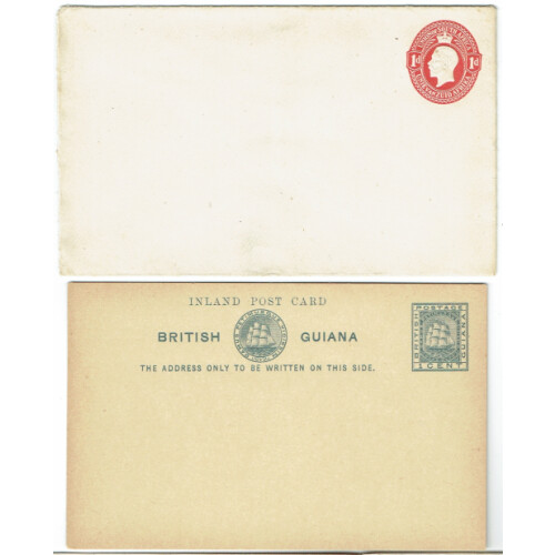 British Commonwealth: Unused postal stationery cards useful selection incl OFS VRI ovpt on regd 4d olive P/S env, Sierra Leone QEII 4d brown regd P/S env., S. Africa GV 1d red P/S env., Basutoland QEII 5c on 6d red unused regd P/S env., Br. Guiana 1c grey ship P/S card. Mainly fine. (5).